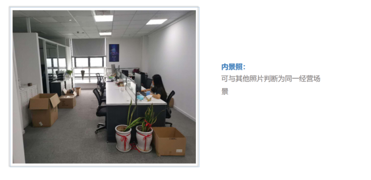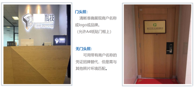 | 经营照片 | 门头照,前台照,内景照 | 1. 照片必须为真实拍摄,证件照片需要露出4个角以便判断证件真实性 2.照片不允许有边框,水印,隔屏拍摄,有修改,截图 |