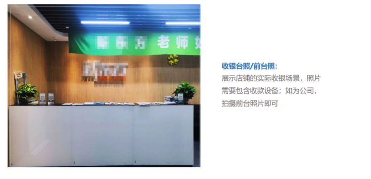 - 店铺环境图片上传说明: - 店铺环境图片,用以说明商户的真实性,需按照规范上传店铺环境图片; - 照片为真实拍摄,严禁 PS,截图,含有水印; - 必须上传店铺门头照,店内经营场所照,店内收银台照; - 三合照需要可看出关联性,如无法判断是否为同一家店需提供视频协助审核;(视频要求从门头拍到店内并拍摄到营业执照以及三合照场景) - 如商户无实体租赁店铺,为流动摊位,三合照可三张相同(法人手持身份证站至摊位前,同时需要拍摄到码牌) - 如门头无招牌或店内处于装修无法判断经营内容,可法人手持营业执照站至门头拍摄替代门头照; - 如门头无招牌或店内处于装修无法判断经营内容,可法人手持营业执照站至门头拍摄替代门头照; - 企业商户收银台照片可使用前台照片替代,店内照片以经营场所替代; - 如门头无招牌,需要提供法人手持营业执照与门头合照; - 若营业执照名称和门头照名称不一致的情况,通过三合照无法判定为同一家商户或三合照场景和营业执照经营范围明显不一致的情况,视情况需提供视频协助审核。(门店视频要求从门头拍到店内,营业执照要拍进去,清晰可见) 3.1 门头照