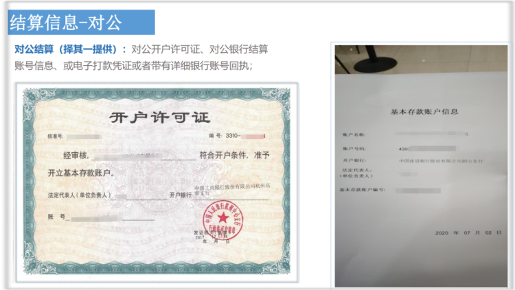 | 结算信息 | 1.对私法人结算:提供结算银行卡卡号面; 2.对私非法人结算:结算人身份证正反面,结算银行卡卡号面,非法人授权函; 3.对公结算:对公账户开户证明 |