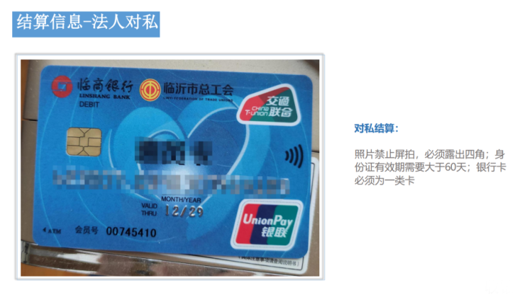 - 结算信息图片上传规范: - 需上传结算卡的银行卡正反面 - 银行卡照片为真实拍摄,严禁截图,PS,含有水印等; - 如对公结算,结算到基本户,上传开户许可证图片;结算到一般户,上传银行印鉴图片或者银行打印流水证明等证明结算户名与商户信息一致的材料; - 如银卡号是在银行卡反面,则传有银行卡号的反面照片; - 如银行卡号磨损,可写在纸上放在旁边拍照上传; - 银行卡禁止贴标签; 4.1 对公结算